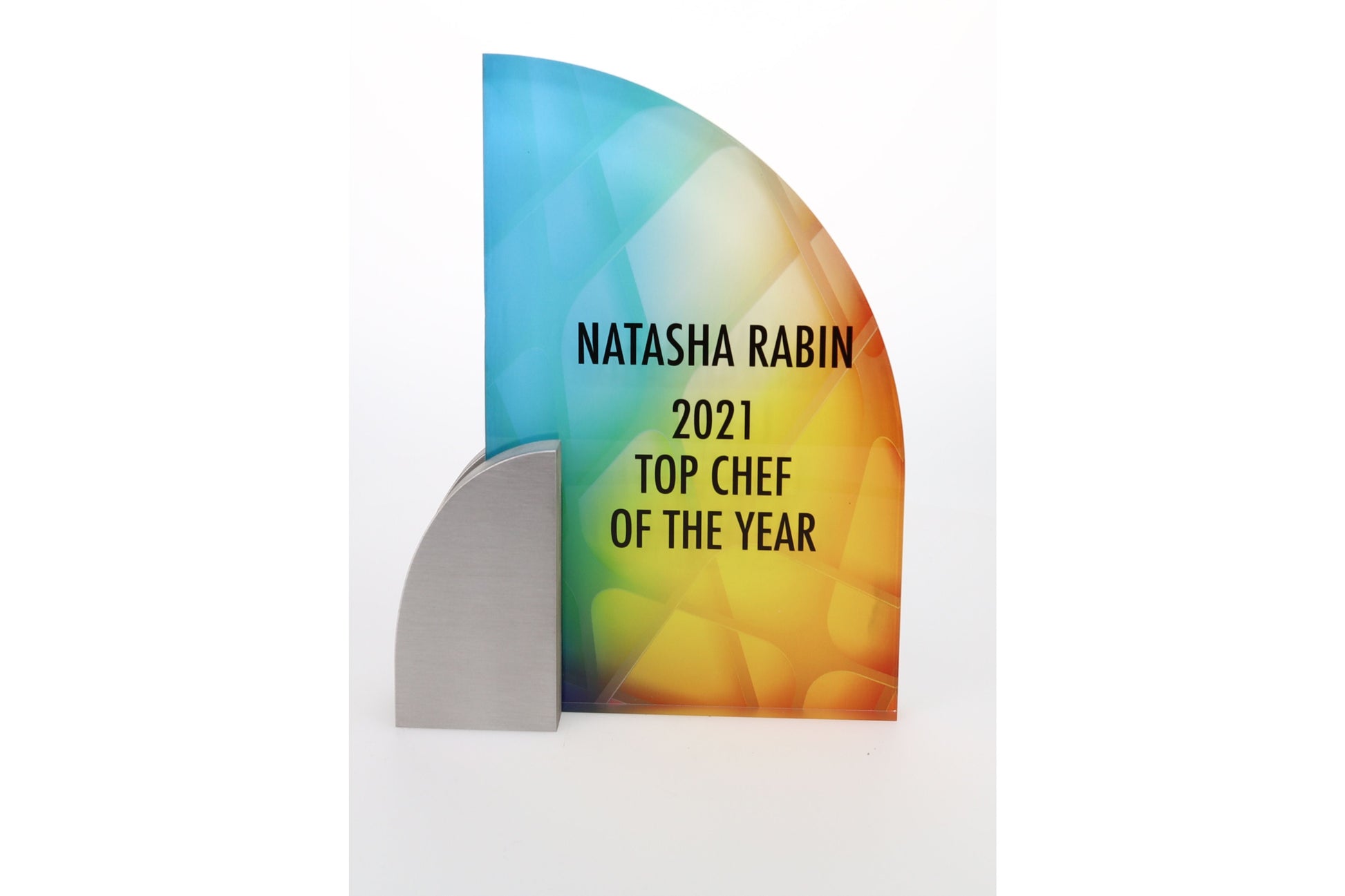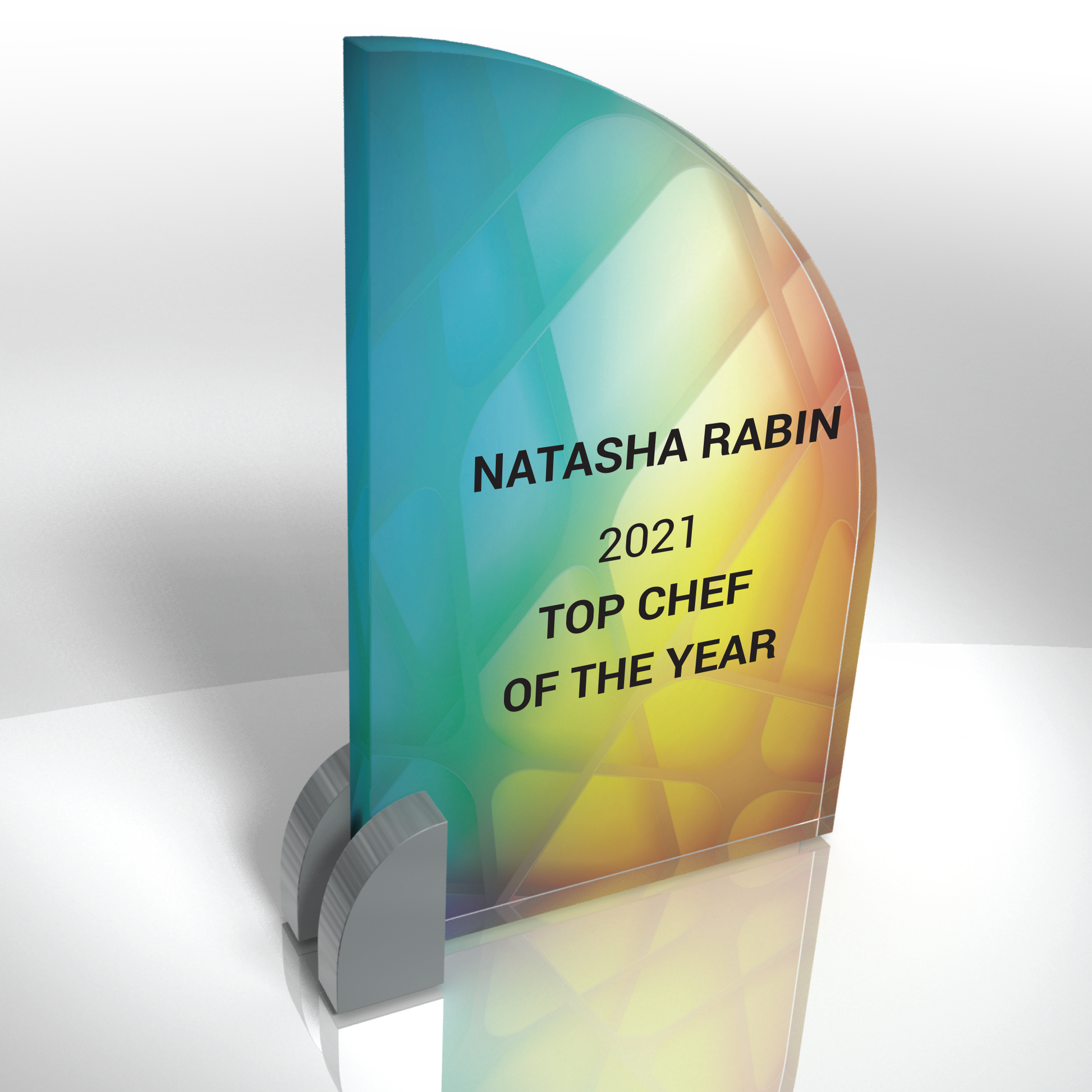 Unexpected, colorful and unique are adjectives often used with the Barcelona Award. Composed of a clear acrylic plate with a back printed with nice colorful designs, the award keeps its balance thanks to the two brushed aluminum pieces in front and back of the main piece.