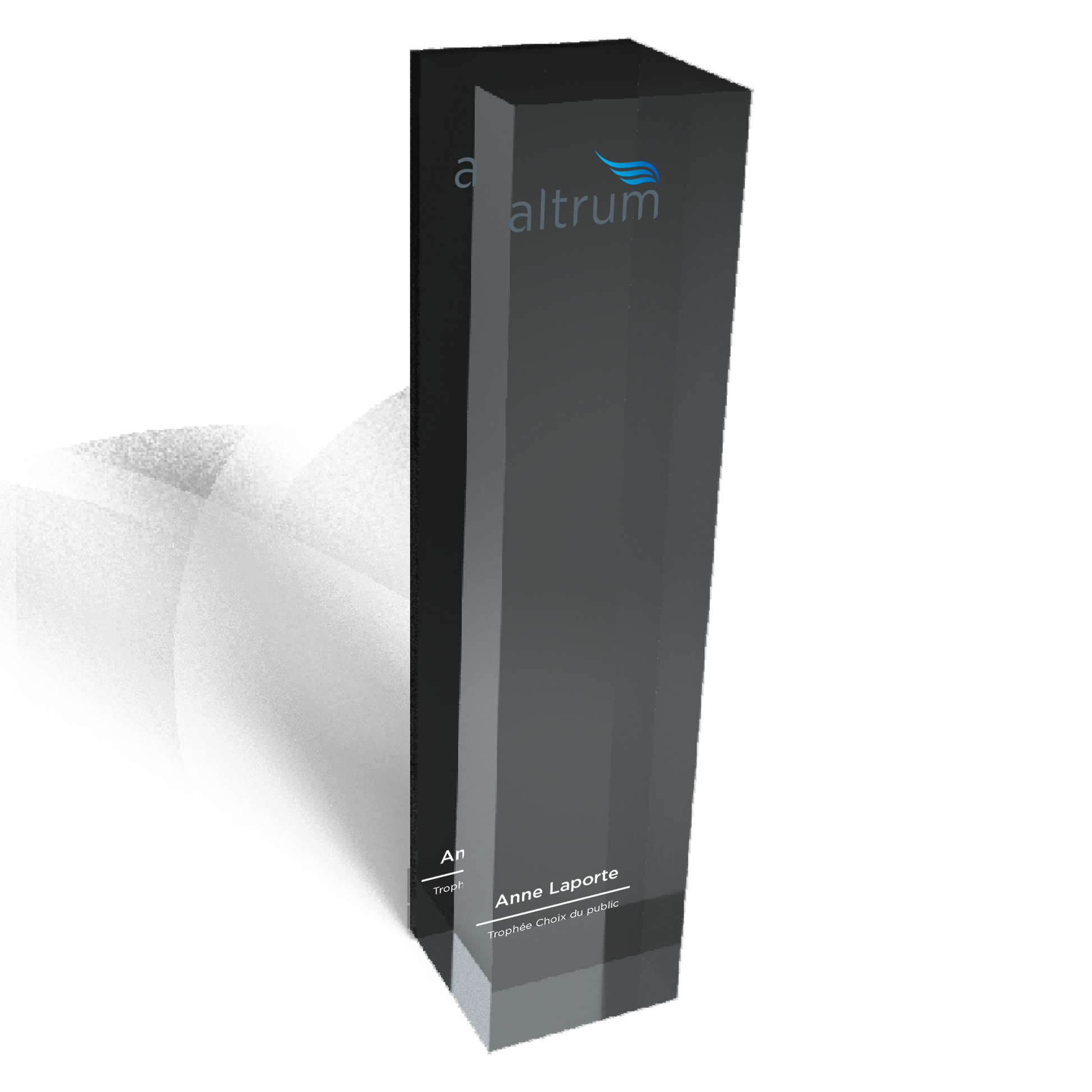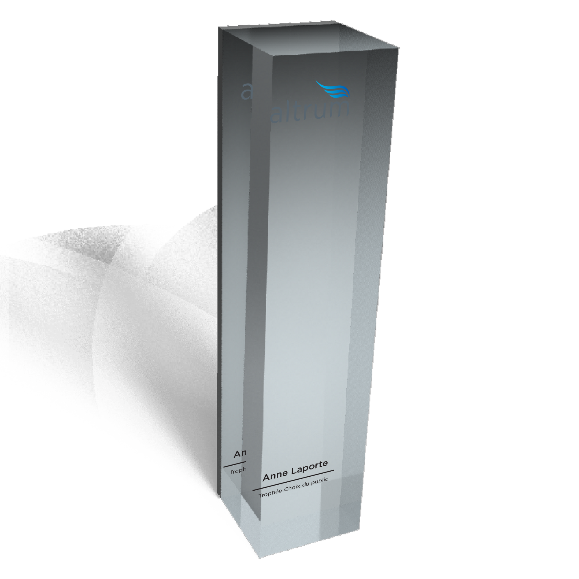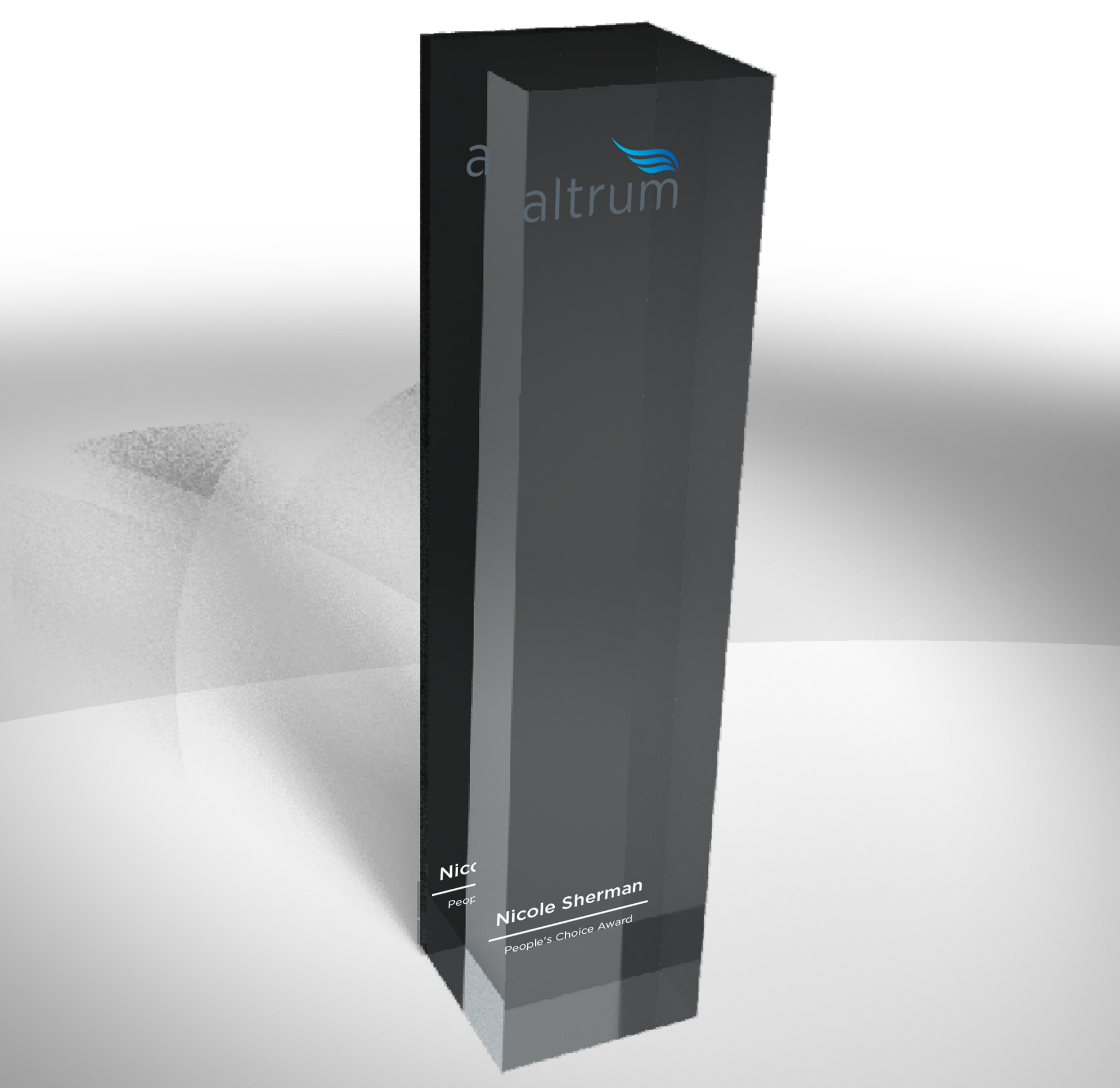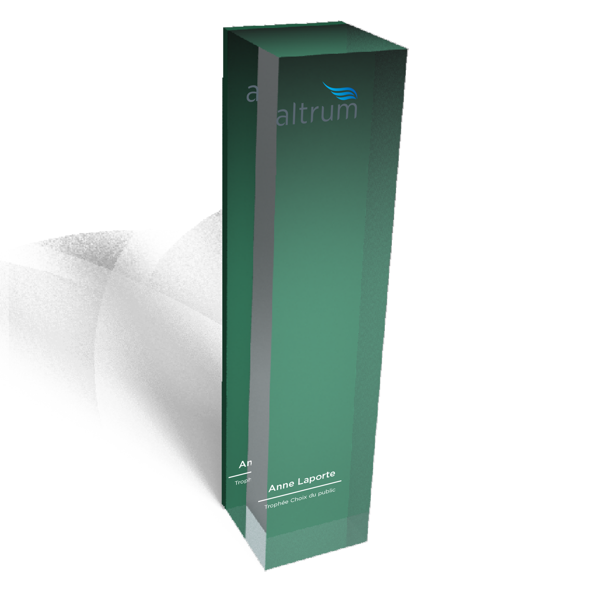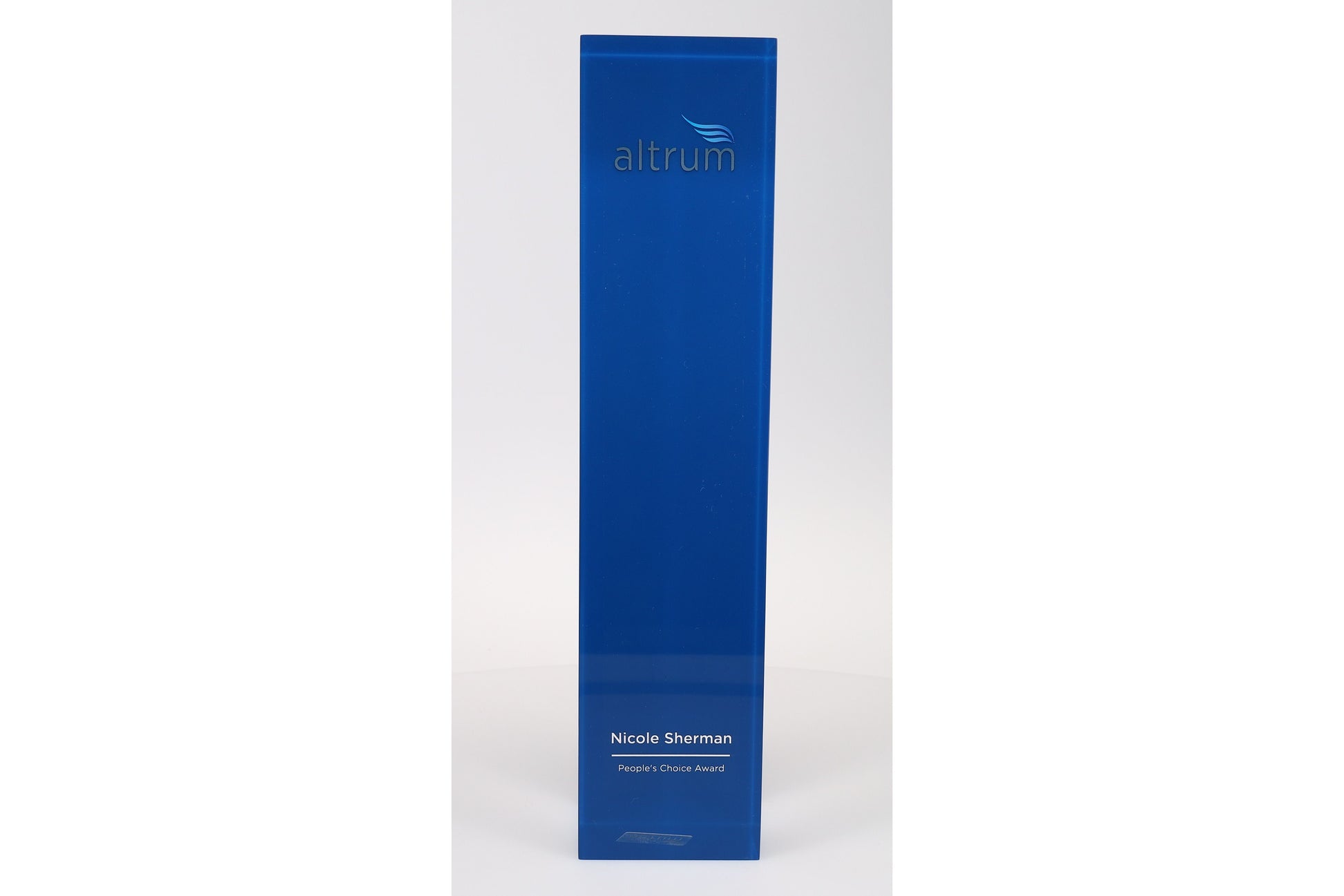 Sleek and classy corporate award to celebrate any important milestone! This award is composed of a colored acrylic panel on the back, layered with a thick clear acrylic panel on the front. Your text and logo will be printed on an acetate and embedded inside the clear acrylic panel, as if they were floating inside your award. This look is high-end, timeless, and will ensure that your award remain intact for years to come.