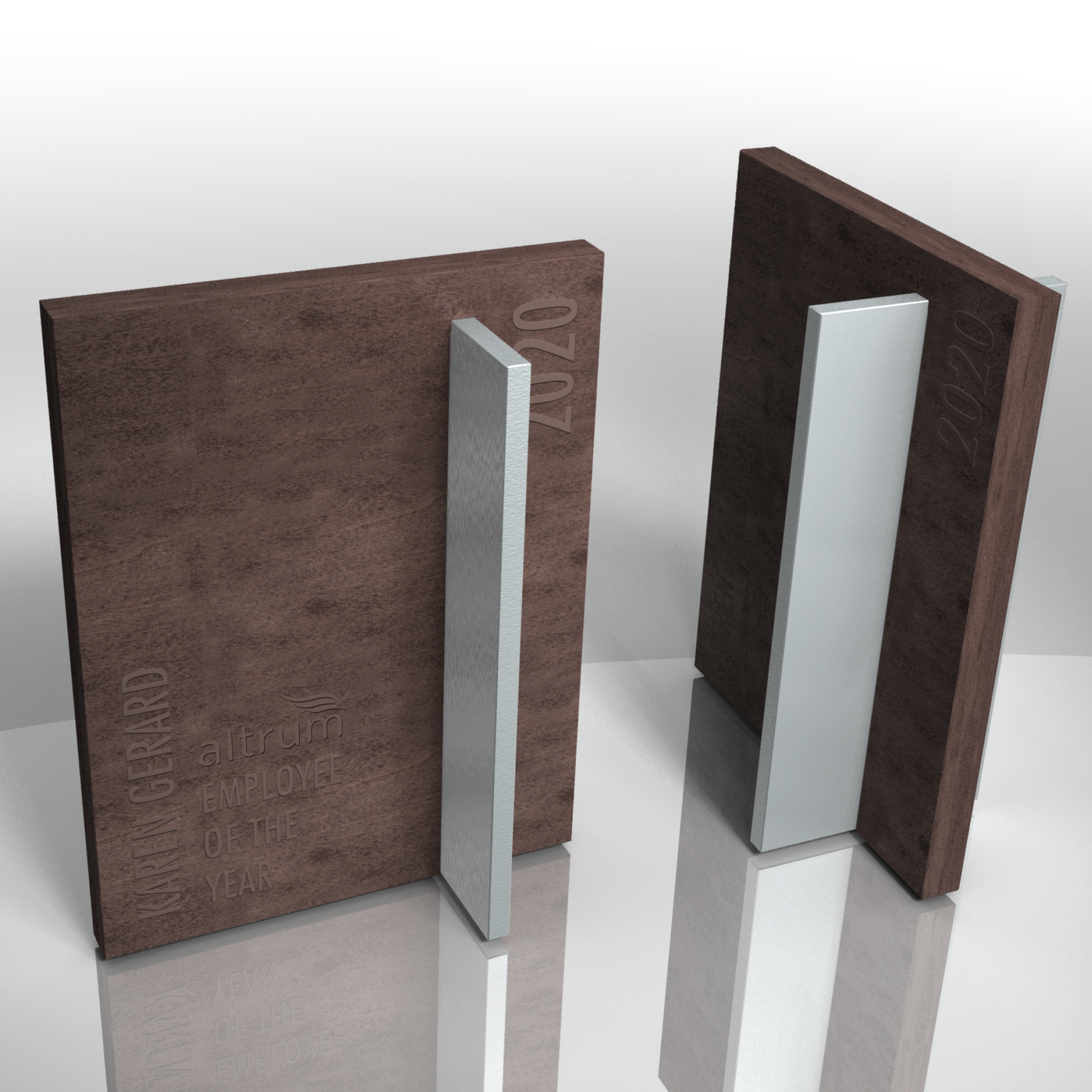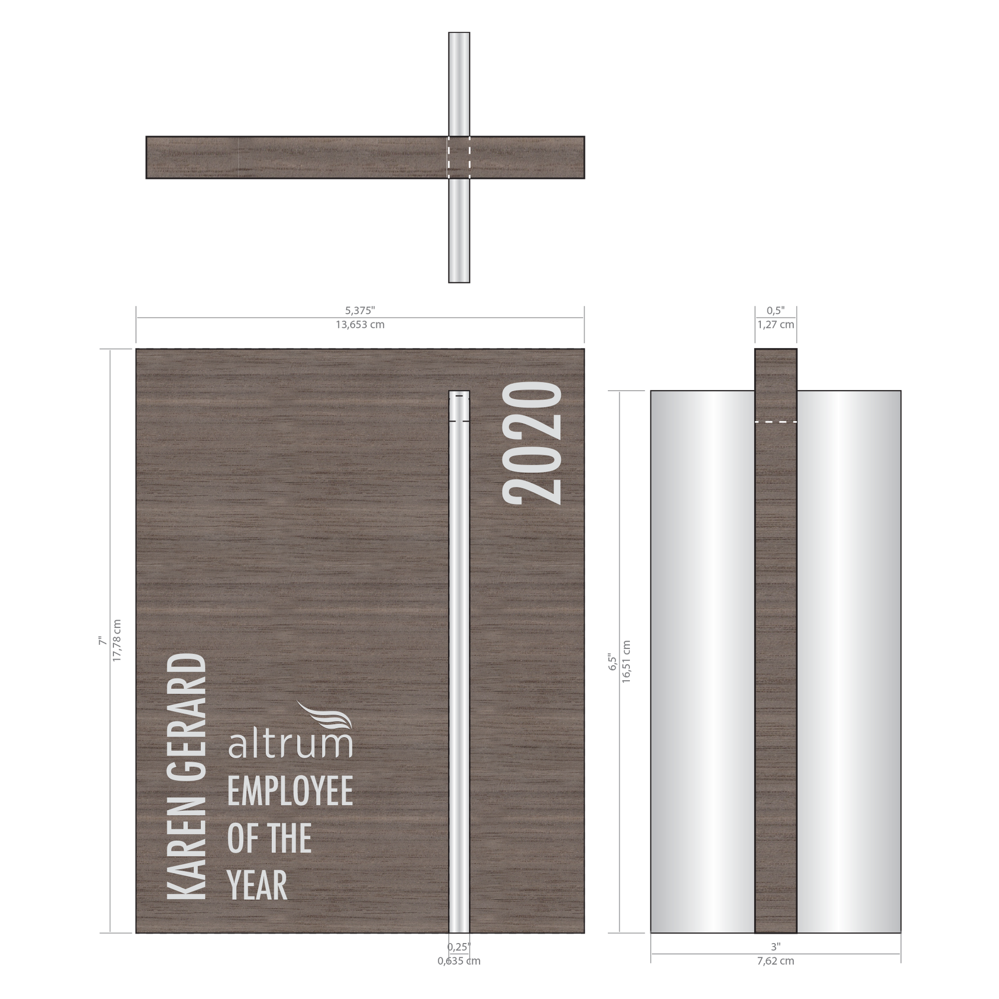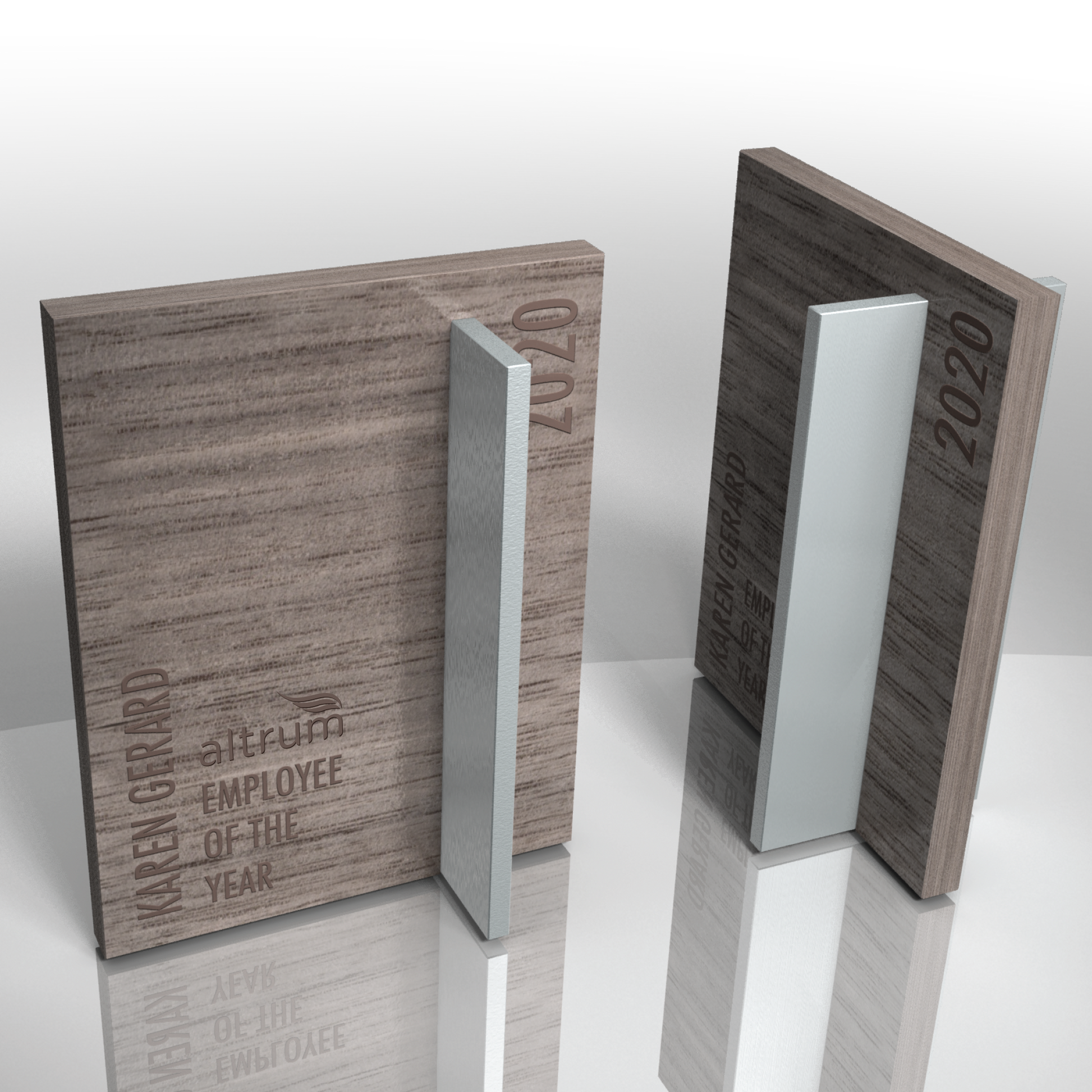 The Santa Fe award is made of a wood plate that fits onto an aluminum plate. You have a choice of three different colors of wood available for the main plate: Maple, Walnut, and a brown tinted wood. The text is printed on the front wood plate.