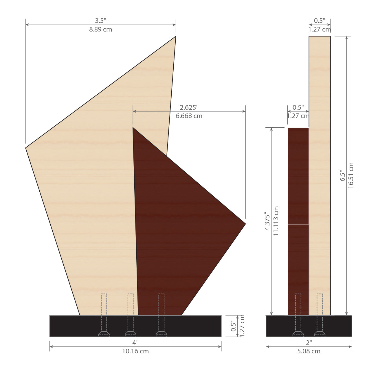 Size: Lasercut wood (3.5”W x 6.5”H x .5”D) Brown tinted wood (2.625”W x 4.375”H x .5”D) Wood airbrushed base (4”W x .5”H x 2”D)