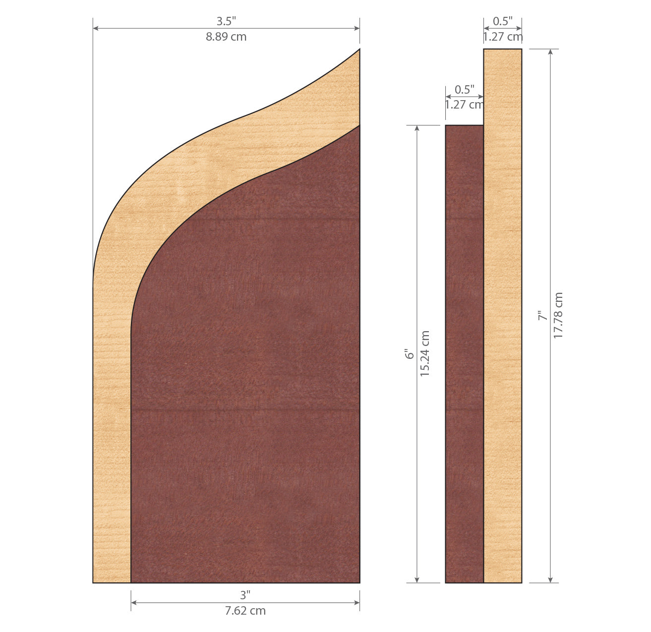 Size: Lasercut maple wood custom shape (3.5”W x 7”H x .5”D) Lasercut tinted wood shape (3”W x 6”H x .5”D)