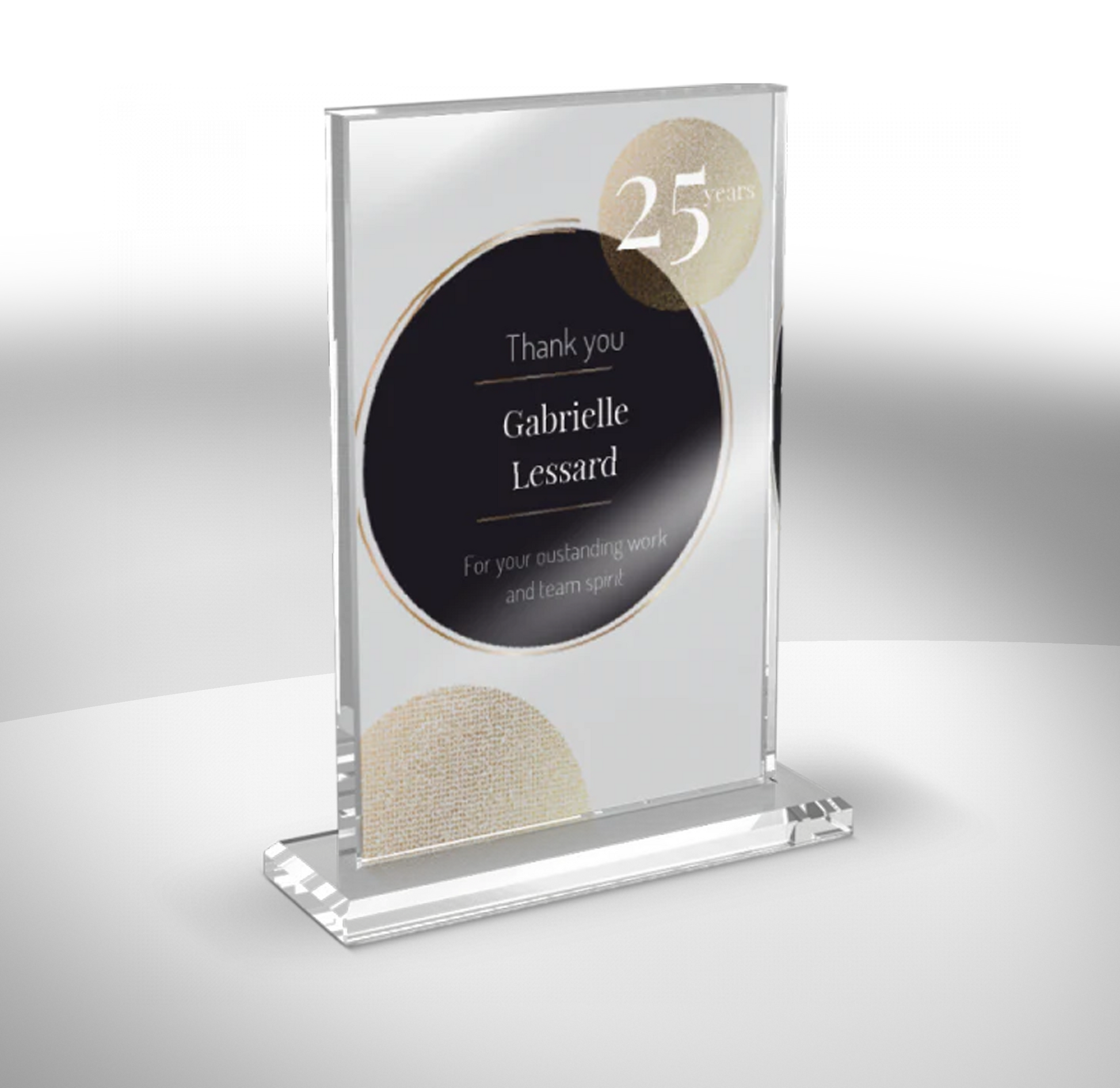 This festive and trendy award is a designer favorite with its mix of shimmer and shine. Personalize it by typing in the appropriate name and adding your logo, and you are all set for a delightful celebration!